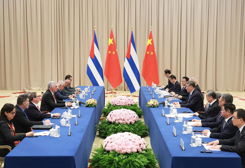 While meeting with Cuban President Miguel Diaz-Canel, Xi noted that this year marks the 65th anniversary of diplomatic ties between China and Cuba, adding that China is willing to further consolidate the ironclad friendship with Cuba, build a closer China-Cuba community with a shared future, and set an example of solidarity and cooperation among socialist countries and sincere mutual assistance among developing countries.